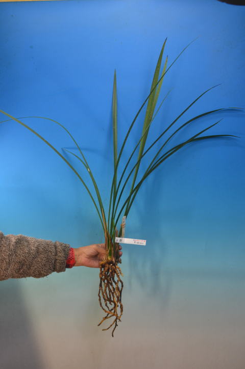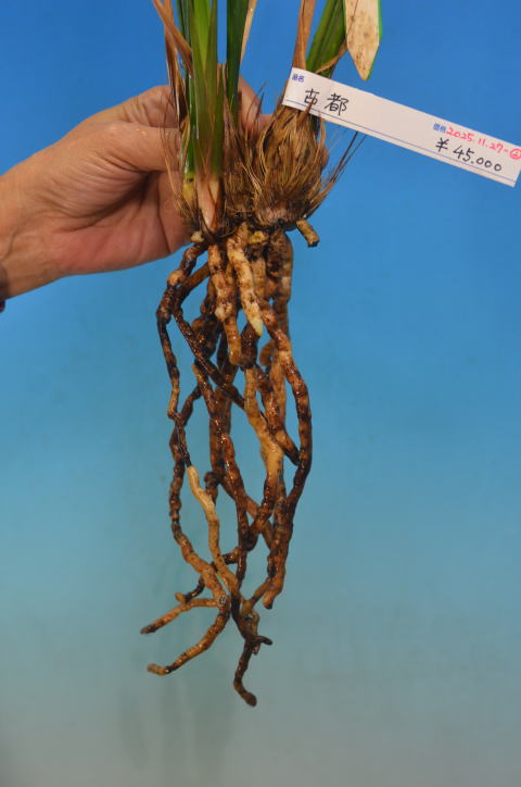 花の特徴:高知県産の登録品 青三角咲きの大輪系で舌は黒ベタです。花間もまあまあ良く、この商品は珍しい程の大株です。