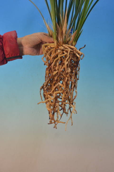 青一文字の最大13cmにもなる特大輪で白舌に赤のベタ舌系です。特に花間も良く当店が今まで見た青で一番いい花です。