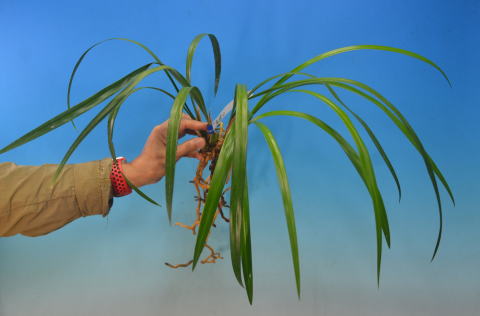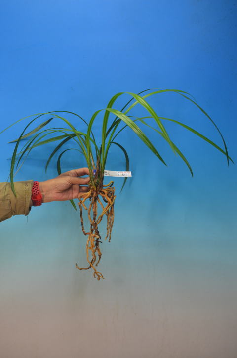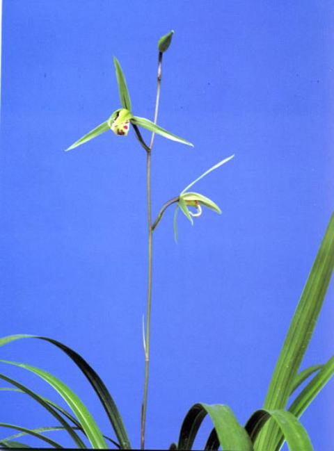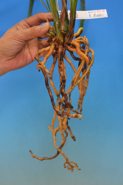 花の特徴:徳島県産の登録品 緑の濃い三角咲きの大輪です。花は最大で12cm、舌は1.5cm程になります。花間も取れるなかなか良い花です。2022年の人吉球磨の展示会で総合優勝し話題になった花です。
