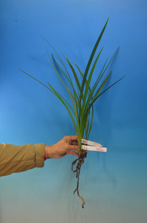 赤紫の平肩に近い三角咲きで、舌は無点系です。花間も良くバランスの良い花です。