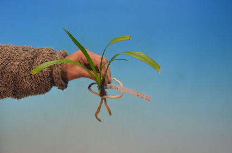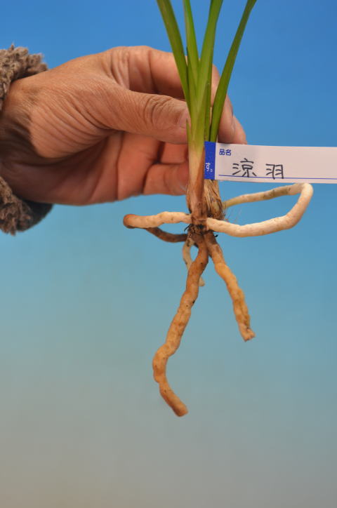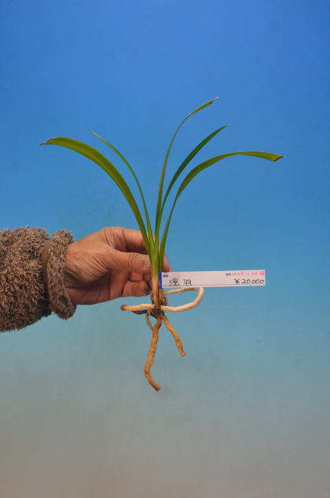 桃の入る青更紗三角咲きの中輪で、色合いの大変綺麗な花です。
