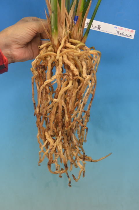 青一文字の最大13cmにもなる特大輪で白舌に赤のベタ舌系です。特に花間も良く当店が今まで見た青で一番いい花です